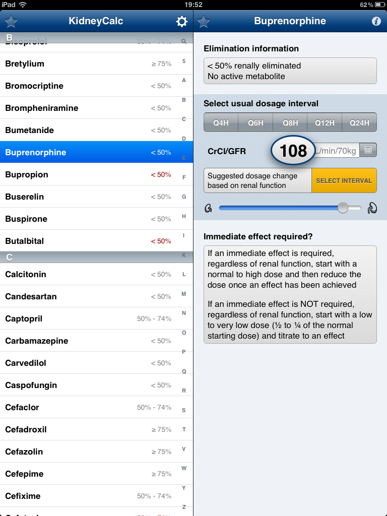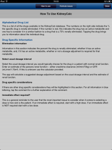 KidneyCalc, ademas, nos da información sobre el medio de eliminación de el medicamento, así como consejos sobre su administración, y si tienen un metabolito activo.