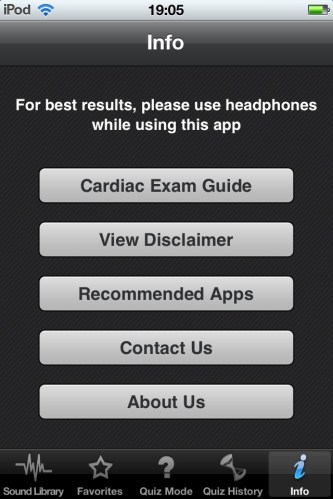 En el iPod/iPhone tenemos la posibilidad de solo escuchar la grabación desde la lista, y en el iPad con solo tocar un elemento de la lista nos mostrará: el sitio de auscultación, una descripción, la fisiopatología, presentación clinica, hallazgos en el examen físico, evaluación diagnostica, tratamiento y links para su busqueda en Google Wikipedia y Medline Plus.