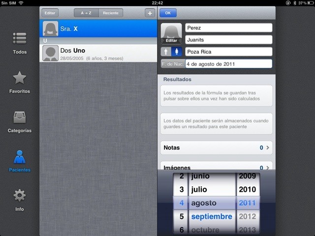 Como app de referencia es muy bueno, ahora pasando a la gestión de pacientes, debo decir que es no creí que pudiera ser tan buena, una ves vamos a agregar un nuevo paciente, ponemos su nombre, fecha de nacimiento, y nos permite agregar fotografías al expediente, y una ves que hacemos un calculo de alguna formula, podemos pulsar sobre el resultado y presionar guardar, donde nos preguntara como queremos guardar si directamente al expediente de un paciente o a un archivo, o bien copiarlo al porta papeles.